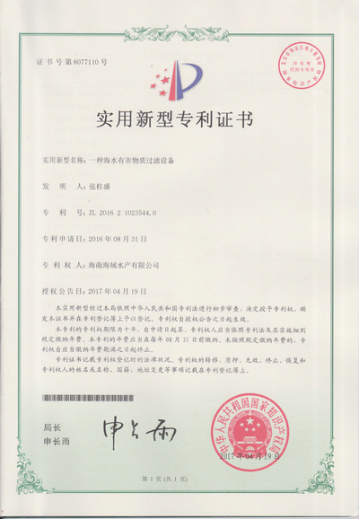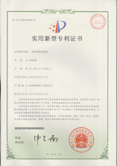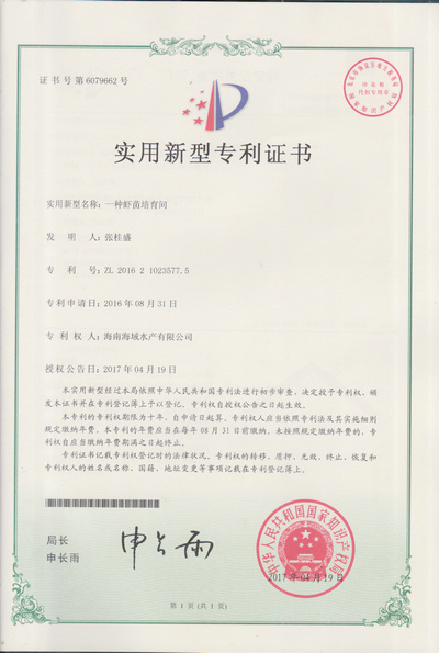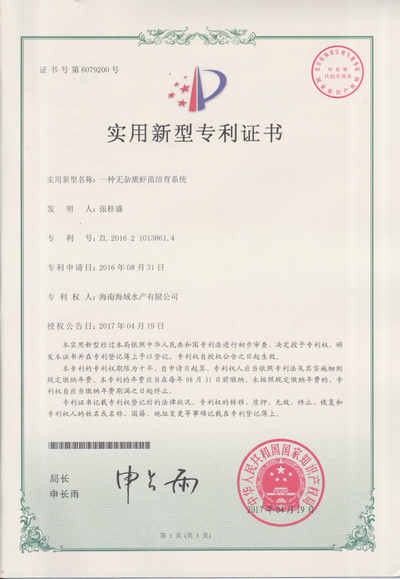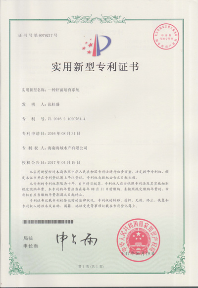 虾苗培育间专利证书