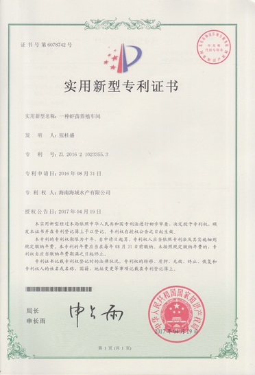 虾苗养殖车间专利证书